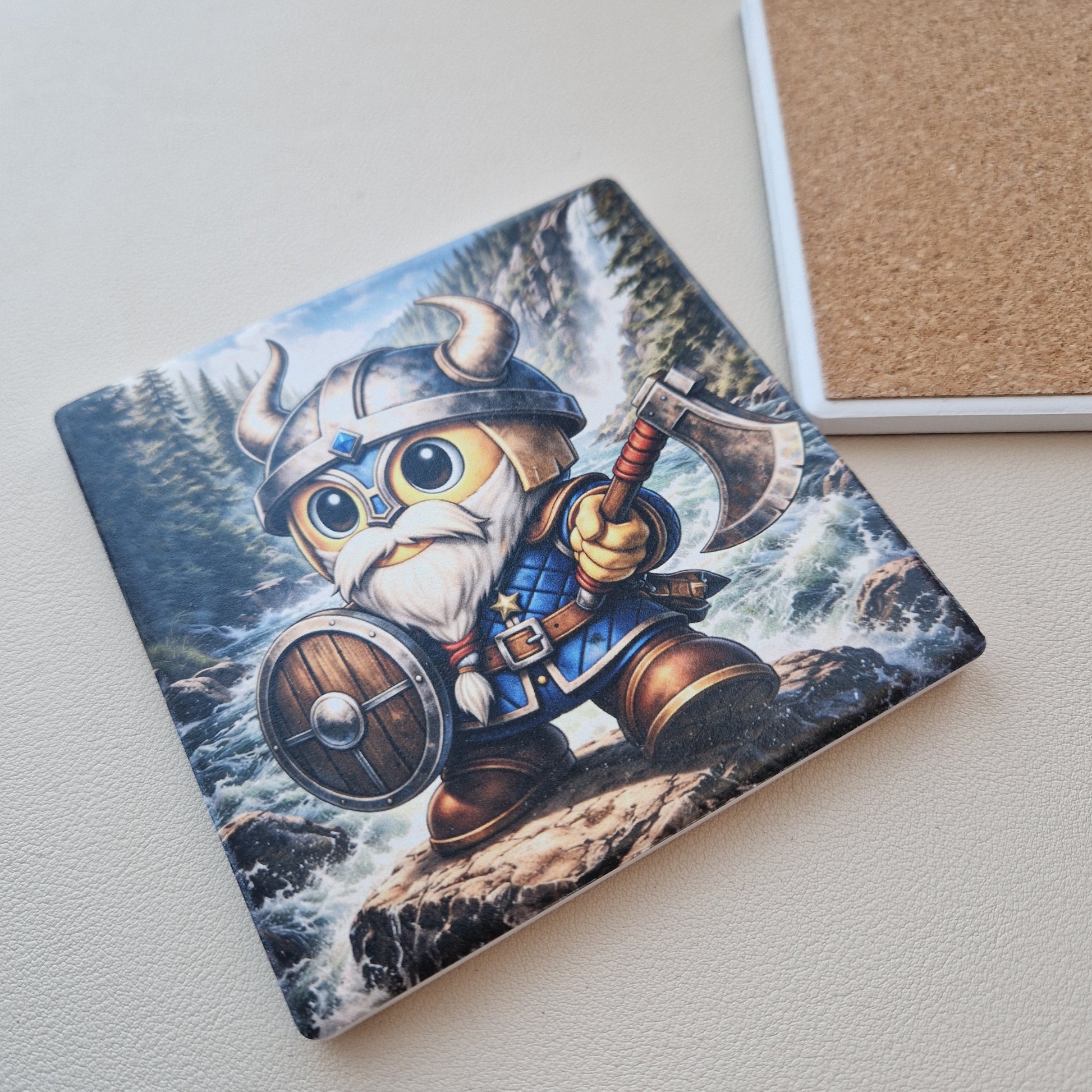 Bring a touch of Nordic adventure to your table with this adorable Viking warrior ceramic coaster. Featuring a charming chibi-style Viking holding an axe and shield while standing beside rushing northern waters, this coaster blends fantasy art with functional home decor.
