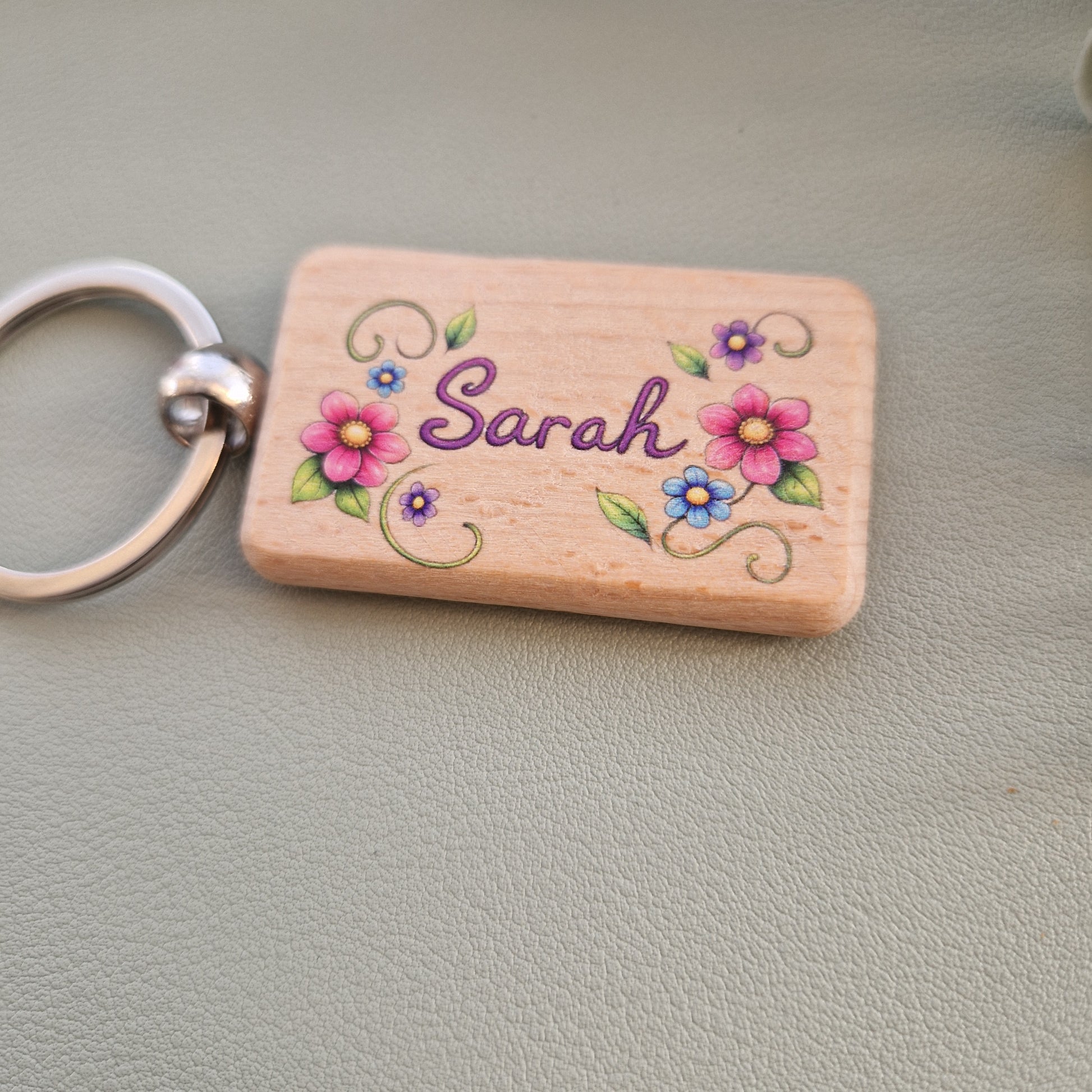 Add a personal touch to everyday essentials with this beautiful personalized wooden keychain, featuring a charming floral design and your chosen name or title. Crafted on a natural wood base, the delicate flowers and colorful lettering create a warm, elegant look that makes each piece truly special.